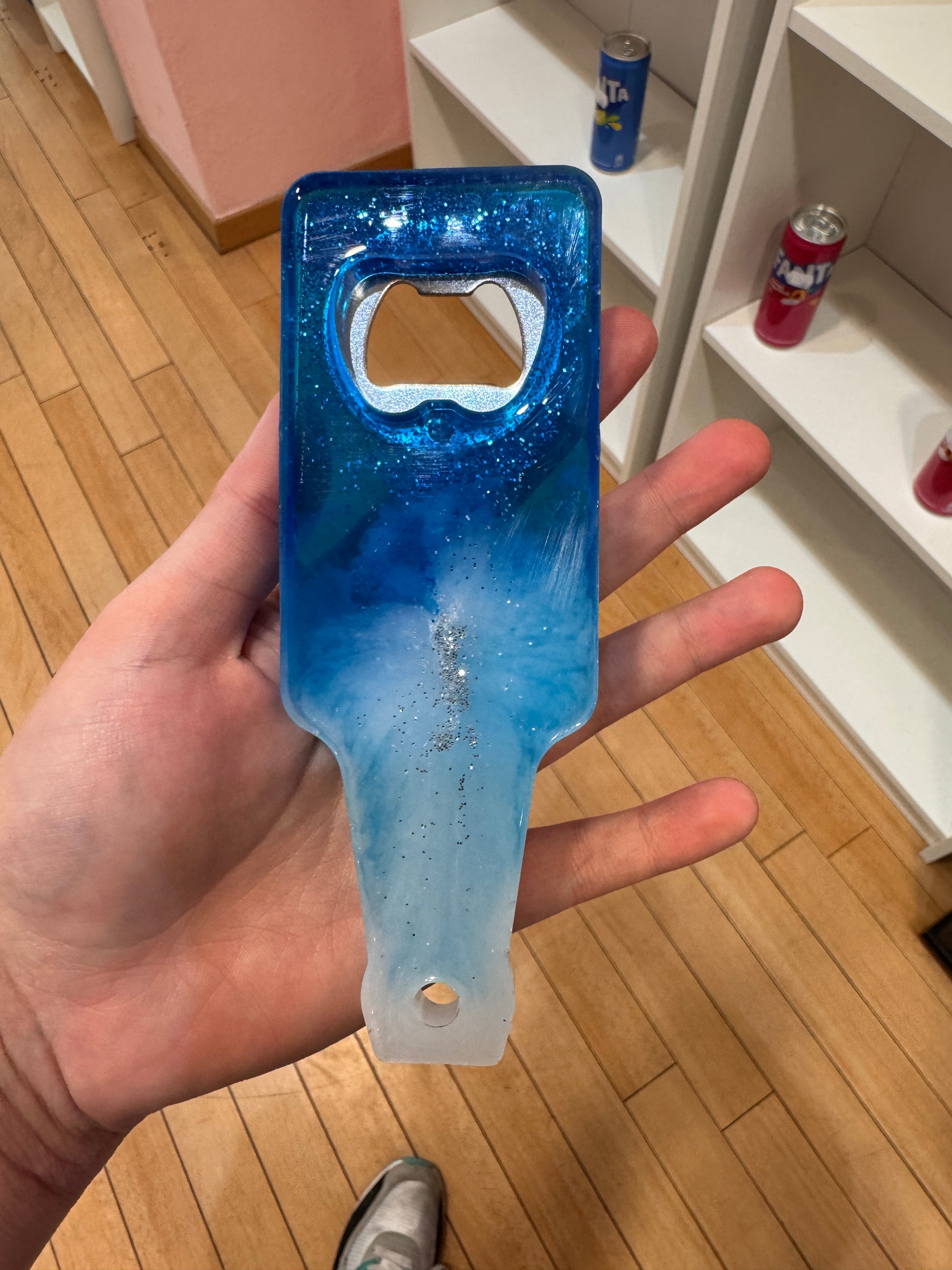 Dieser Flaschenöffner ist absolut einzigartig und selbst zusammen gestellt. Mit den Silber Glitzer und der blau-weiß Vermischung ein absoluter Hingucker.